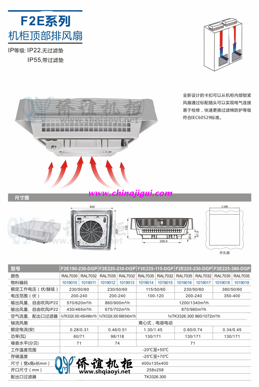 配電柜頂裝風(fēng)扇是一款的電氣柜頂裝散熱產(chǎn)品,其原理是根據(jù)熱氣上升 冷氣下沉的的設(shè)計,柜內(nèi)的熱氣主要集中在柜內(nèi)頂部,此時利用頂部抽熱風(fēng)的方式效果。外形設(shè)計新穎根據(jù)迷宮屋頂式外形,防雨又防塵,安全性能極高,風(fēng)扇使用品牌后傾式離心風(fēng)機(jī),高速運(yùn)轉(zhuǎn)、風(fēng)量大,運(yùn)行穩(wěn)定。特別適合用于高溫,環(huán)境十分惡劣,要求苛刻的場合